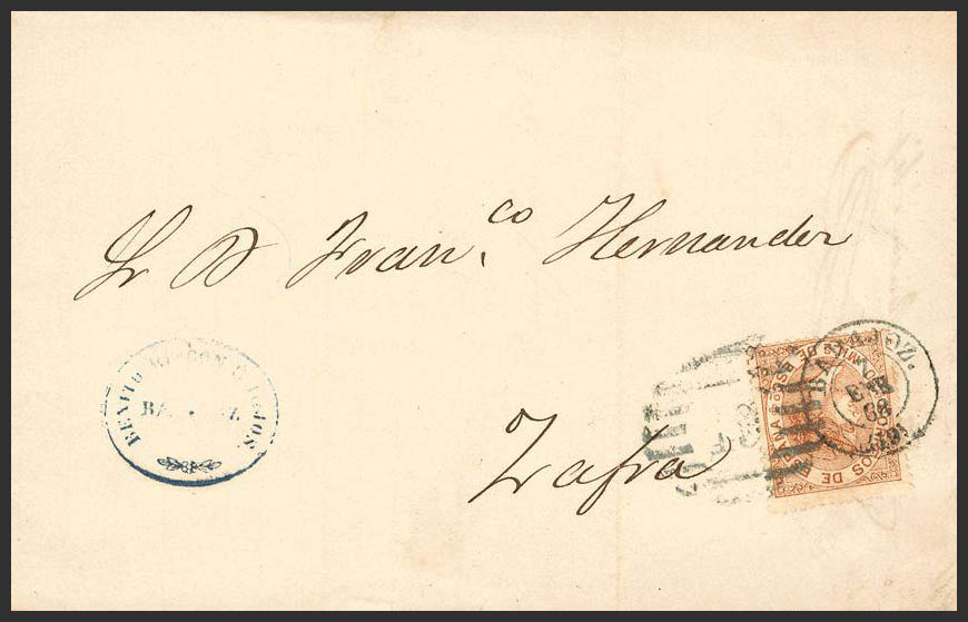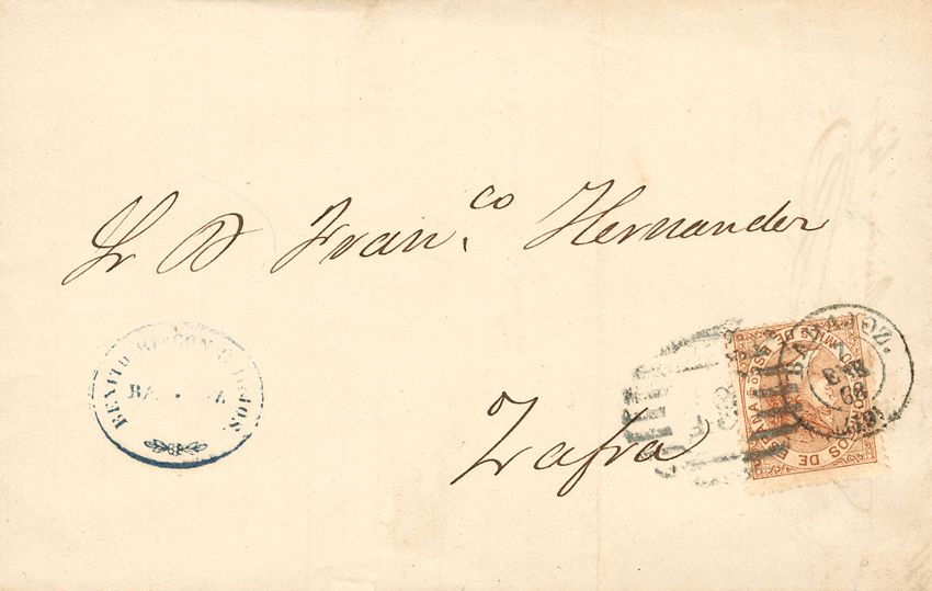 96. 1868. 50 mils castaño. BADAJOZ a ZAFRA. Matasello PARRILLA Nº19, en azul. MAGNIFICA Y RARA.
