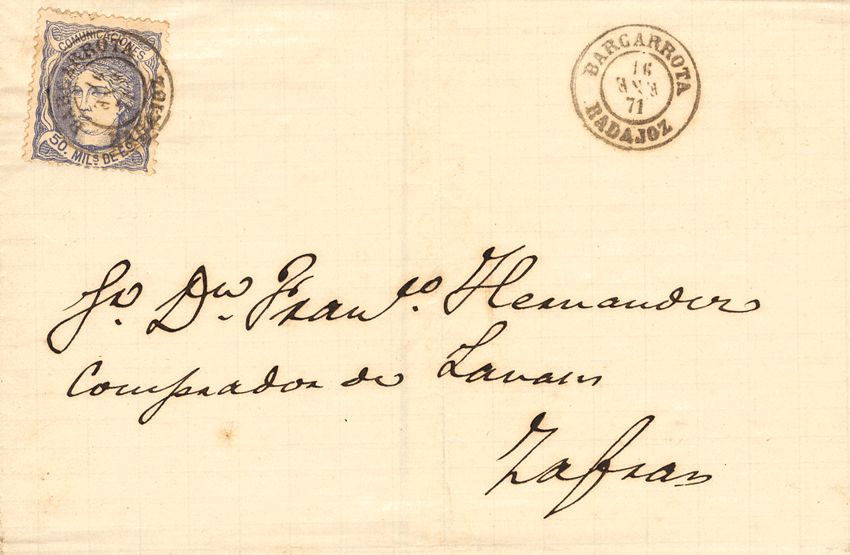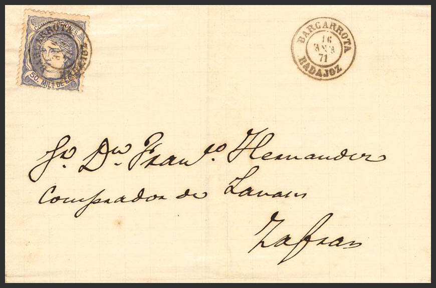 107. 1871. 50 mils azul. BARCARROTA a ZAFRA. Matasello BARCARROTA / BADAJOZ. MAGNIFICA.