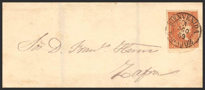 48. 1859. 4 cuartos rojo. BIENVENIDA a ZAFRA. Matasello BIENVENIDA / BADAJOZ (Tipo I). MAGNIFICA.