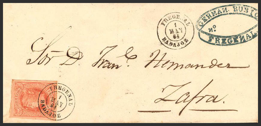 64. 1864. 4 cuartos rosa. FREGENAL a ZAFRA. Matasello FREGENAL / BADAJOZ. MAGNIFICA.
