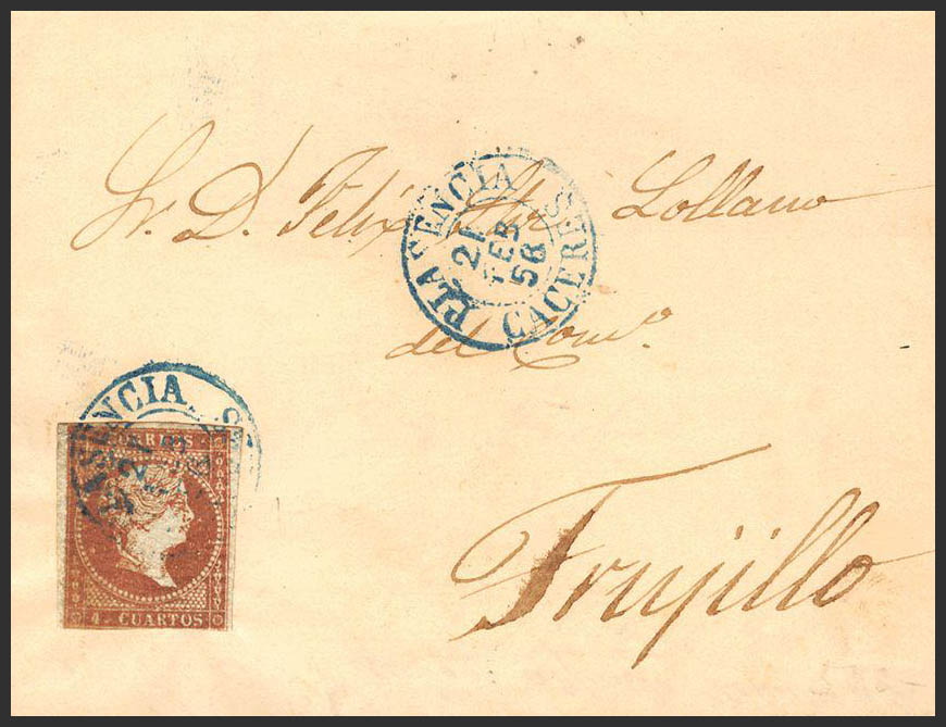 40. 1856. 4 cuartos rojo. PLASENCIA a TRUJILLO. Matasello PLASENCIA / CACERES (Tipo I), en azul. MAGNIFICA.