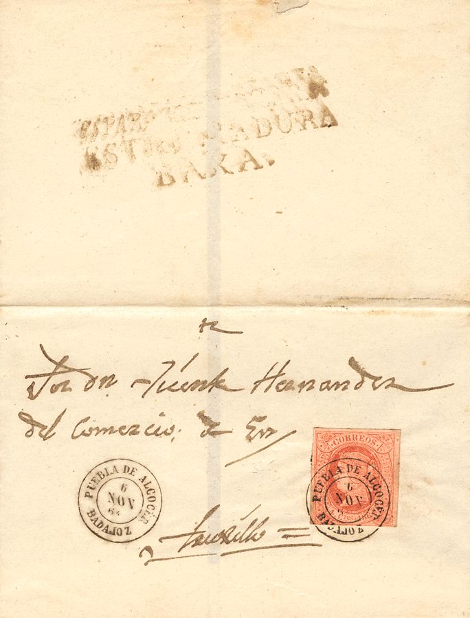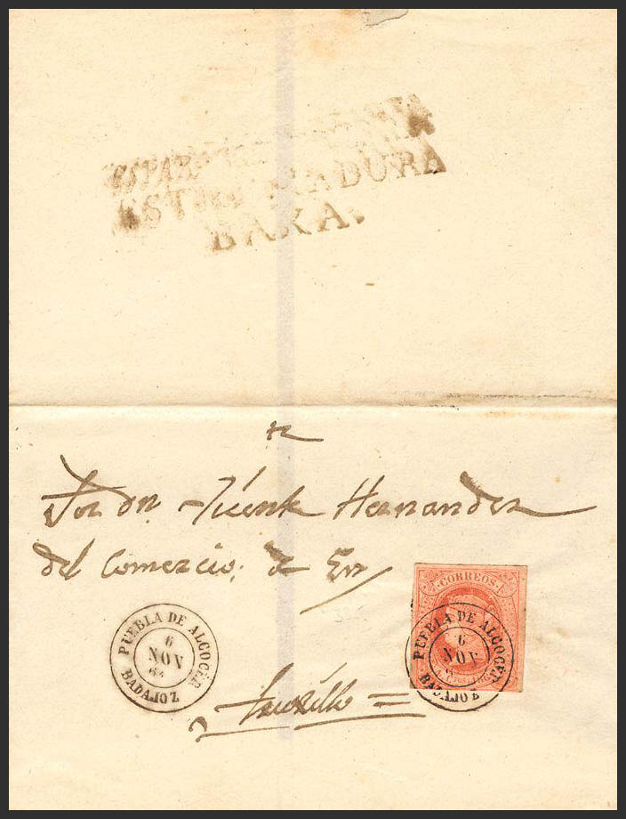 64. 1864. 4 cuartos salmón. PUEBLA DE ALCOCER a TRUJILLO. Matasello PUEBLA DE ALCOCER / BADAJOZ, al dorso marca prefilatélica ESPARRAGOSA DE LARES / ESTREMADURA / BAXA. MAGNIFICA.