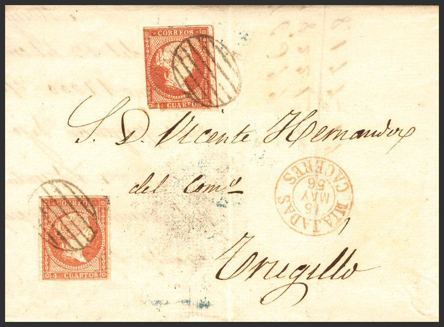 Extremadura. Historia Postal. En el frente MIAJADAS / CACERES (Tipo I), en rojo. Doble porte. MAGNIFICA.