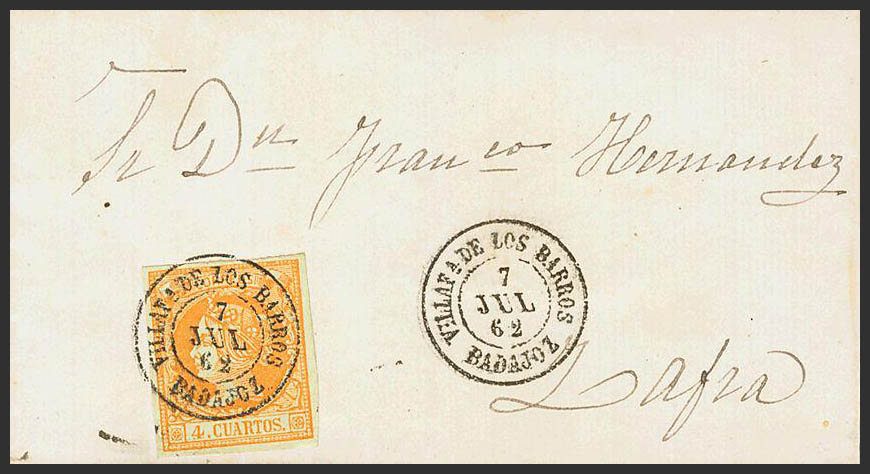 52. 1862. 4 cuartos amarillo. VILLAFRANCA DE LOS BARROS a ZAFRA. Matasello VILLFª DE LOS BARROS / BADAJOZ. MAGNIFICA.