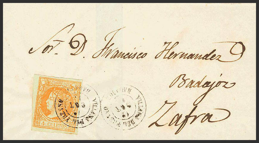 52. 1861. 4 cuartos naranja. VILLANUEVA DEL FRESNO a ZAFRA. Matasello VILLANª DEL FRESNO / BADAJOZ. MAGNIFICA Y RARISIMA.