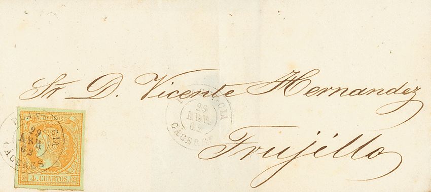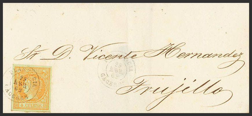 52. 1862. 4 cuartos naranja. PLASENCIA a TRUJILLO. Matasello PLASENCIA / CACERES. MAGNIFICA.