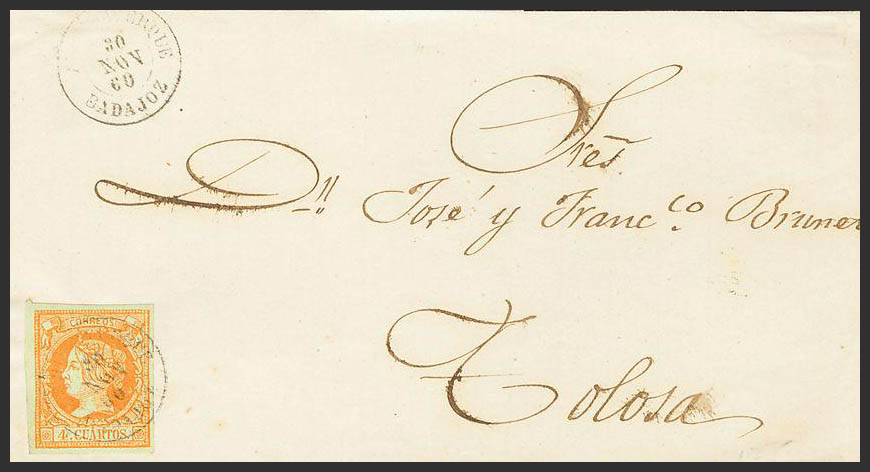52. 1860. 4 cuartos naranja. ALBURQUERQUE a TOLOSA. Matasello ALBURQUERQUE / BADAJOZ. MAGNIFICA Y RARA.