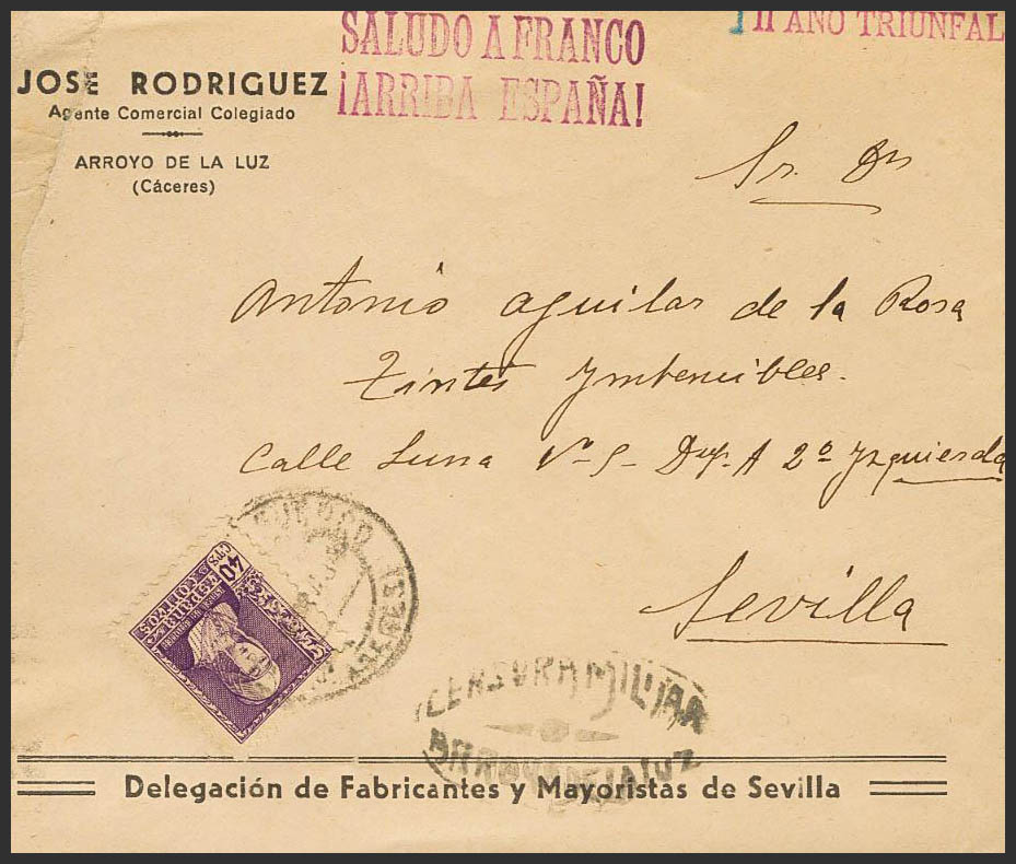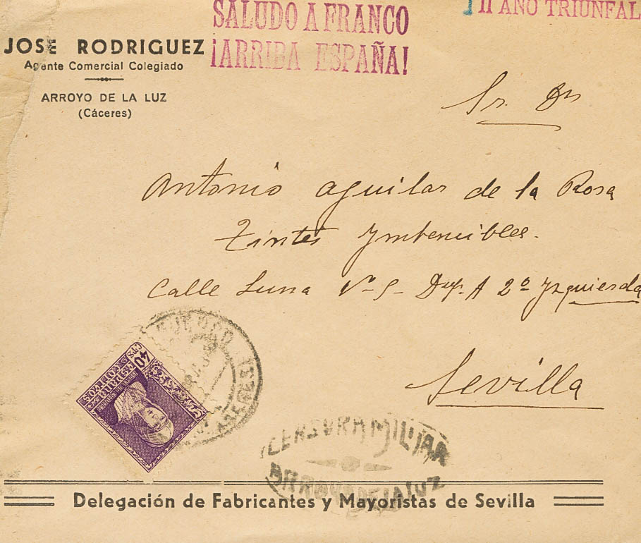 Extremadura. Historia Postal. CENSURA MILITAR / ARROYO DE LA LUZ, al dorso llegada. MAGNIFICA.