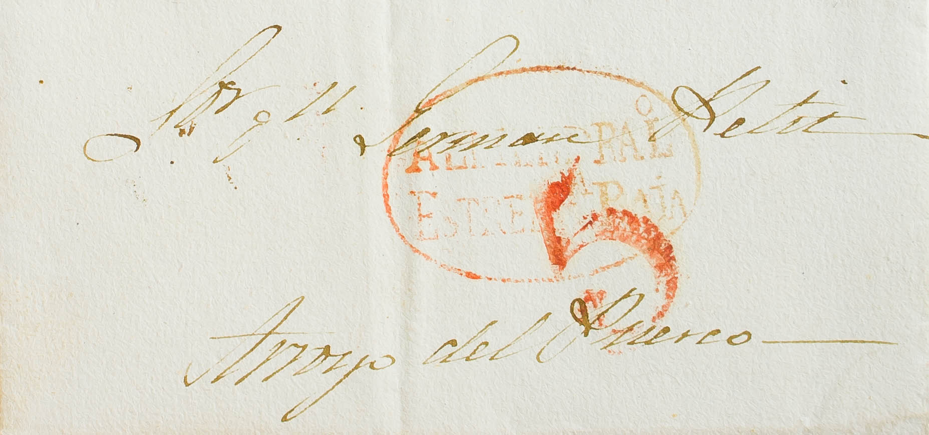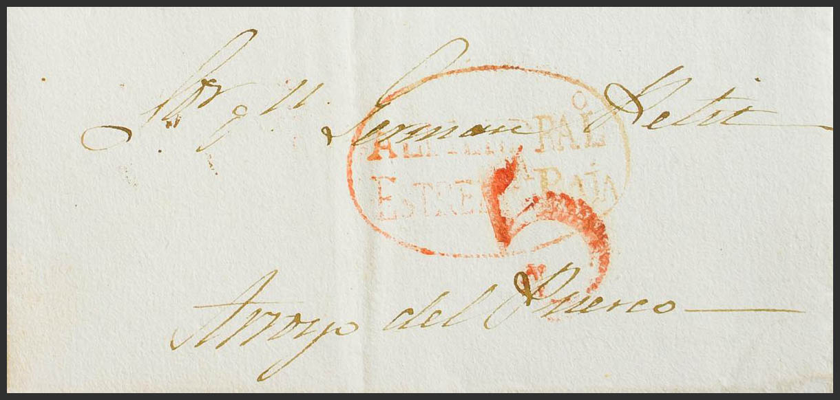 1841. ALMENDRALEJO a ARROYO DEL PUERCO. Marca ALMENDRALº / ESTREMª. BAJA, en rojo (P.E.3) edición 2004. MAGNIFICA.