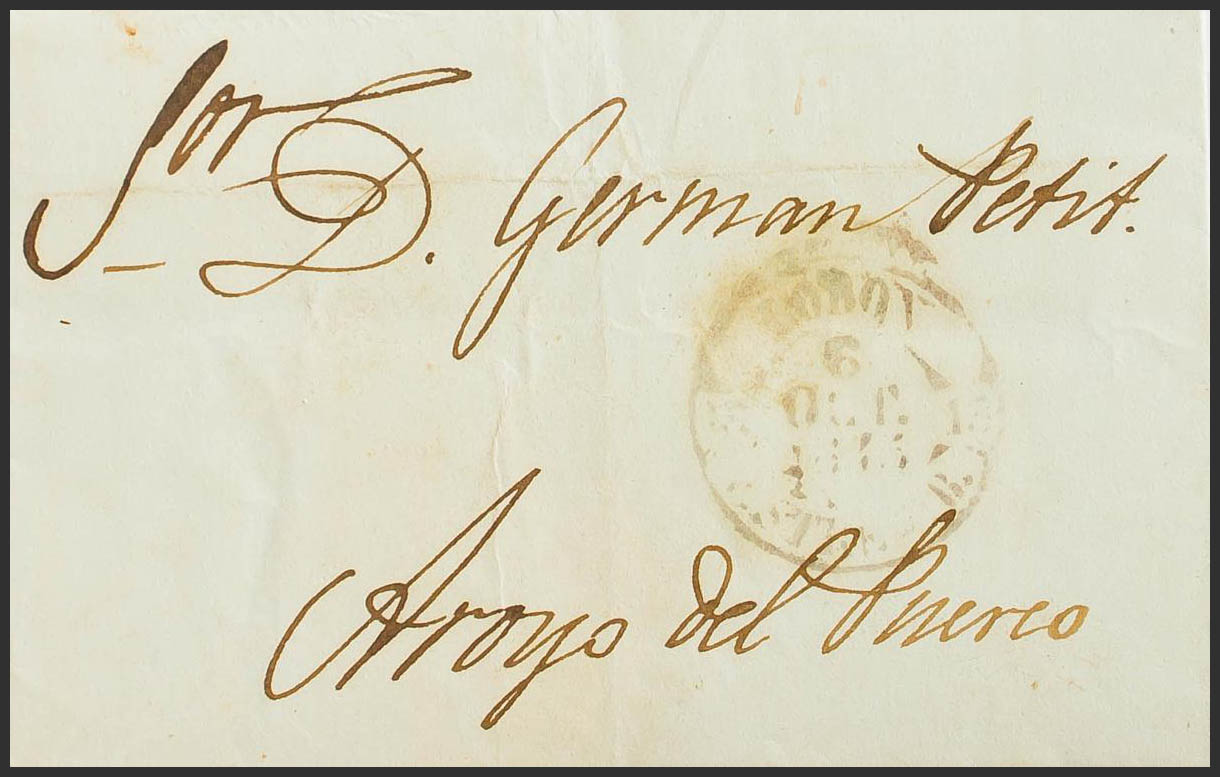 1845. PUEBLA DE LA CALZADA a ARROYO DEL PUERCO. Baeza LOBON / ESTREM. B., en negro. MAGNIFICO Y MUY RARO.
