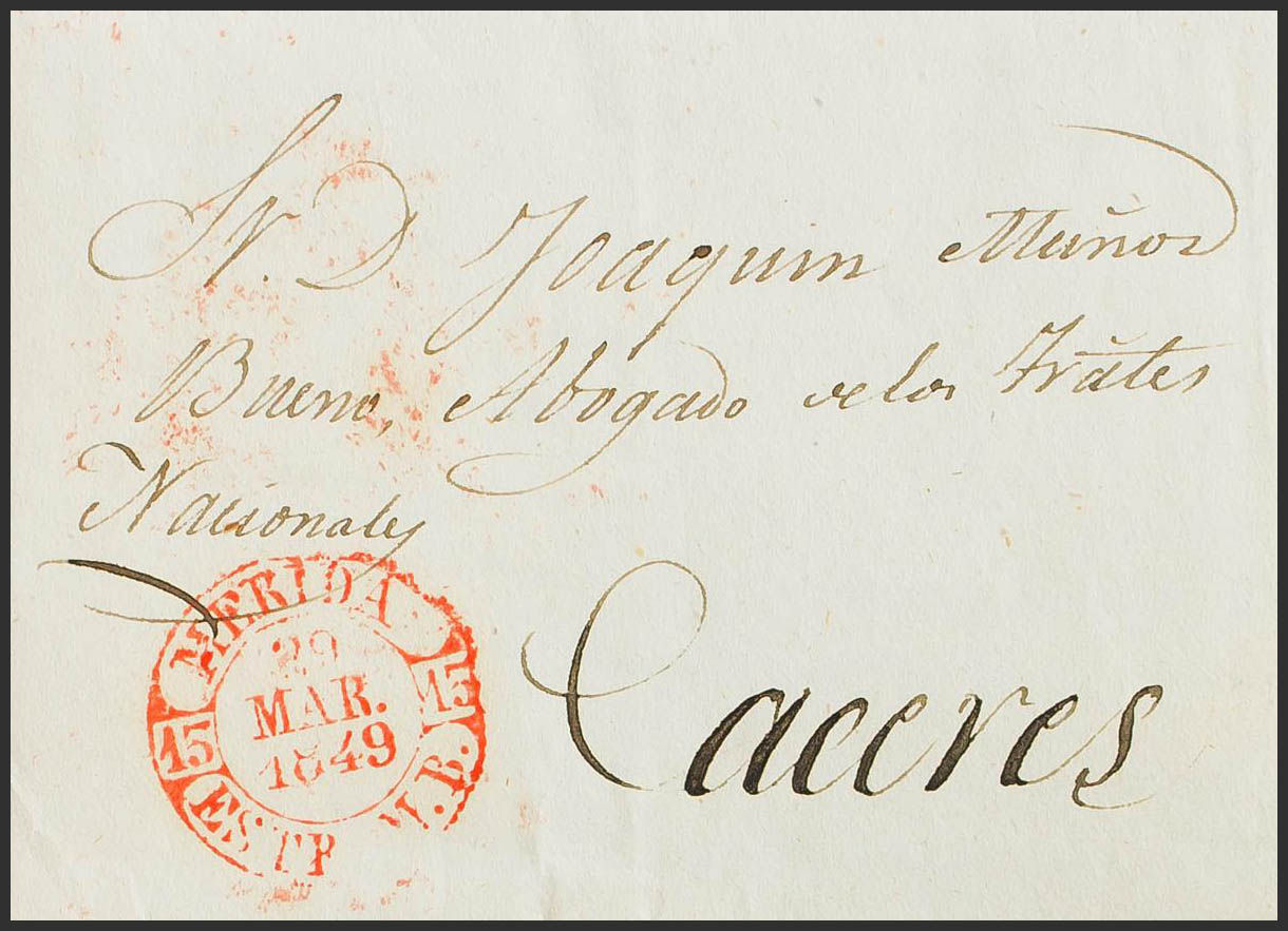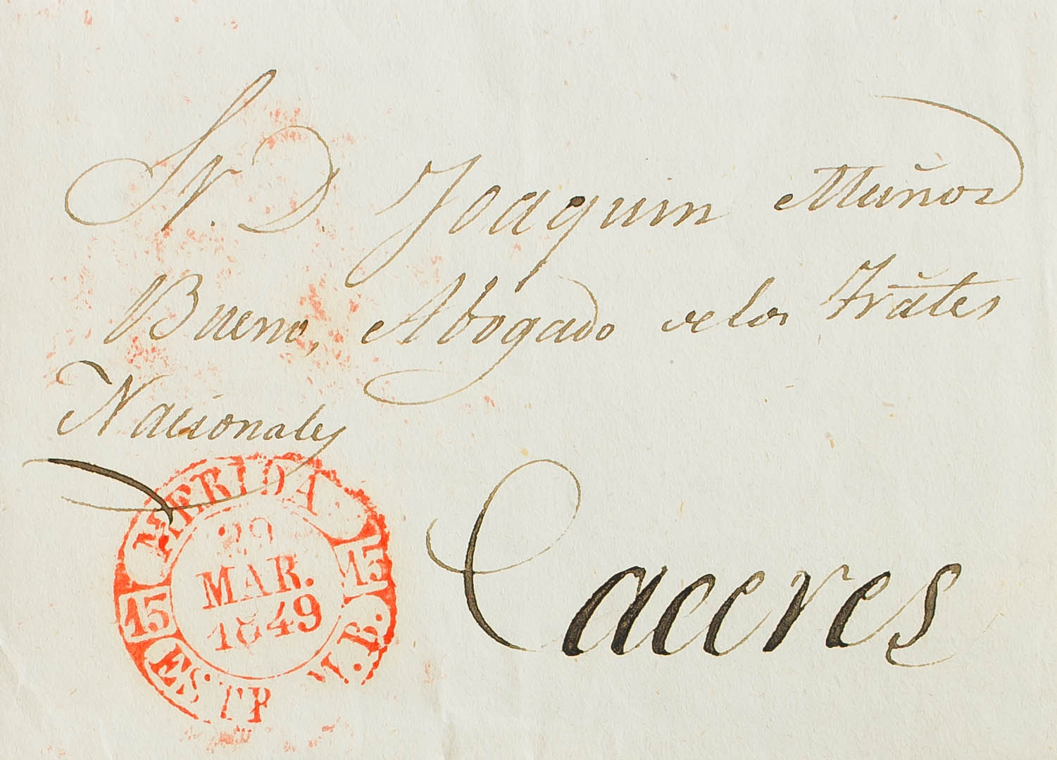 1849. MERIDA a CACERES. Baeza MERIDA / ESTREM.B., en rojo. MAGNIFICA.