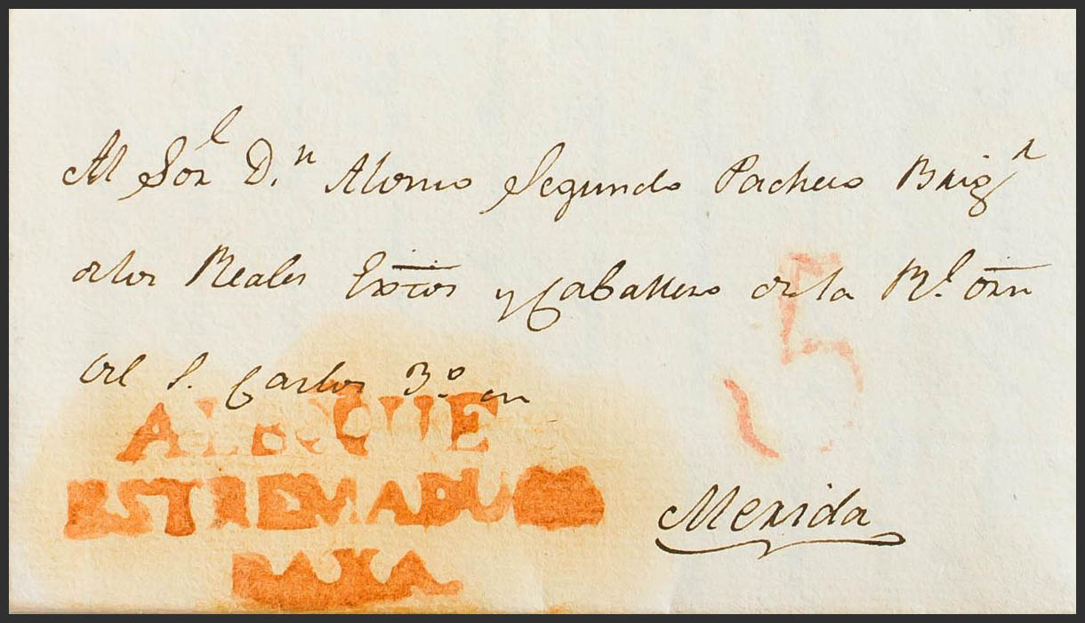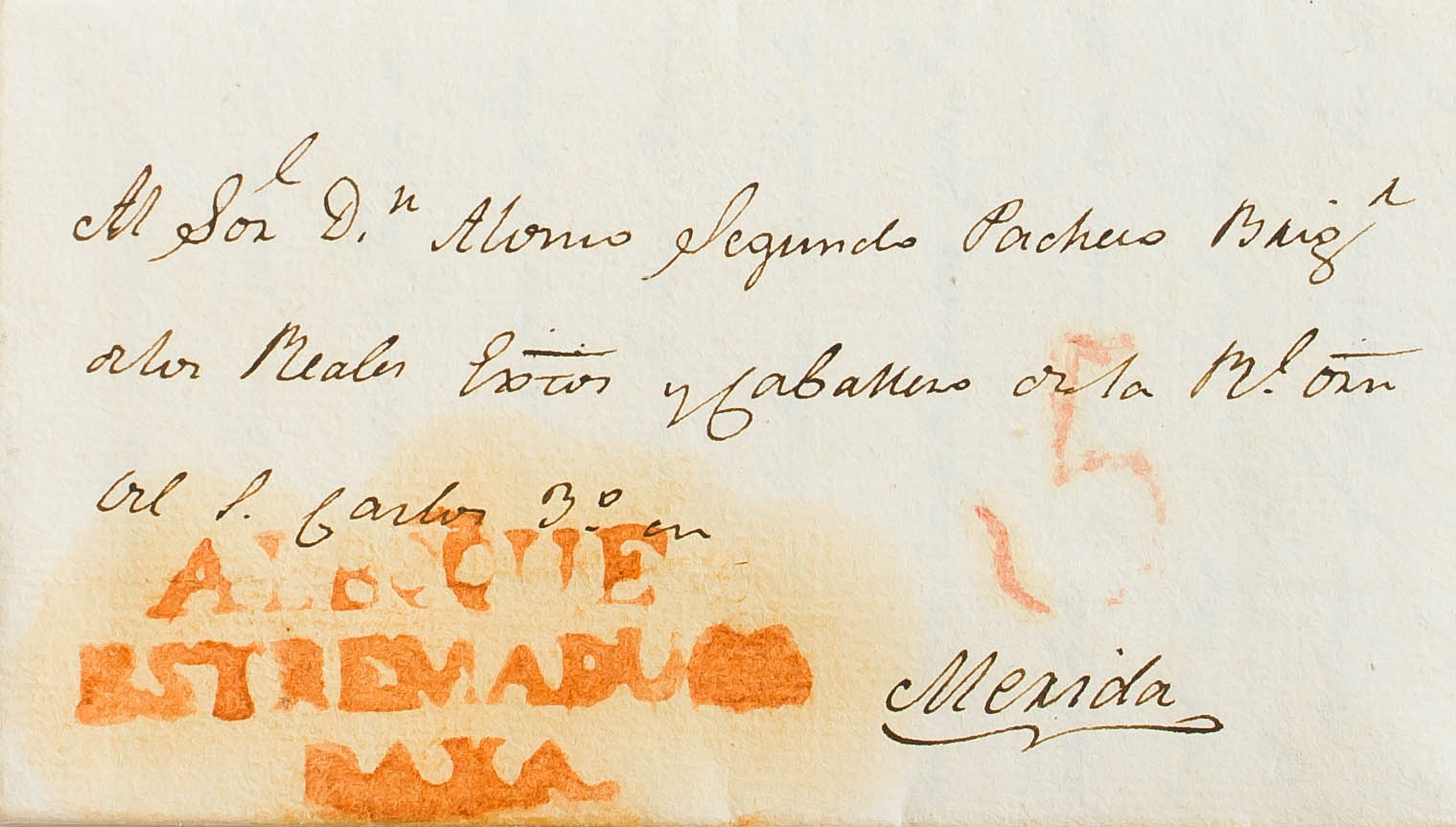 1834. ALBURQUERQUE a MERIDA. Marca ALBQQUE / ESTREMADURA / BAXA, en rojo (P.E.3) edición 2004. MAGNIFICA.