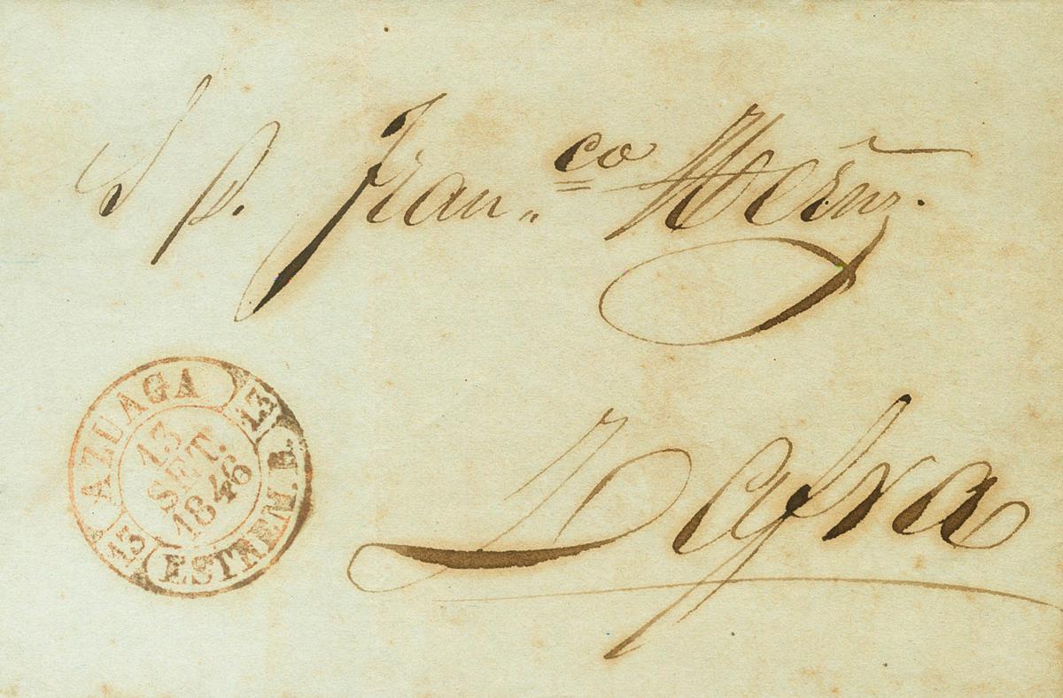 1846. AZUAGA (BADAJOZ) a ZAFRA. Baeza AZUAGA / ESTREM.B., en rojo. MAGNIFICA.