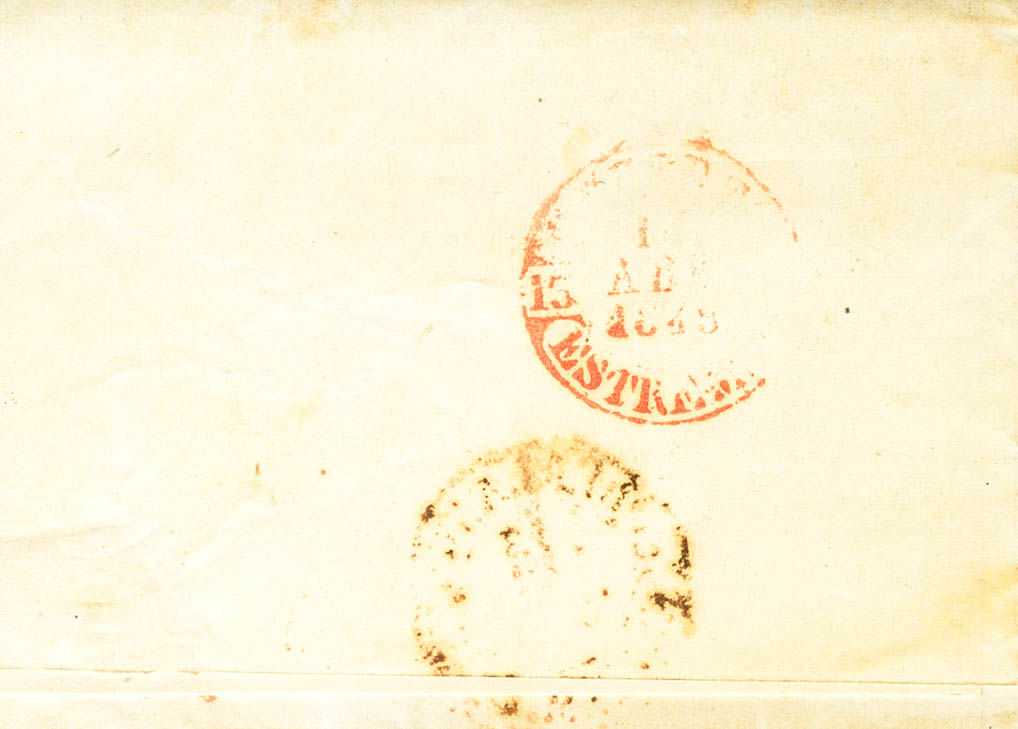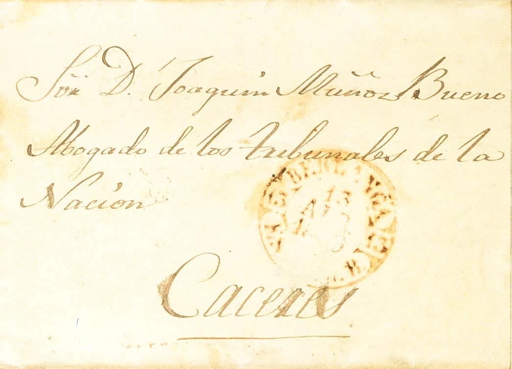 1849. CARRIL DE LLERENA (BADAJOZ) a CACERES. Baeza BERLANGA / ESTREM.B., en rojo. MAGNIFICA.
