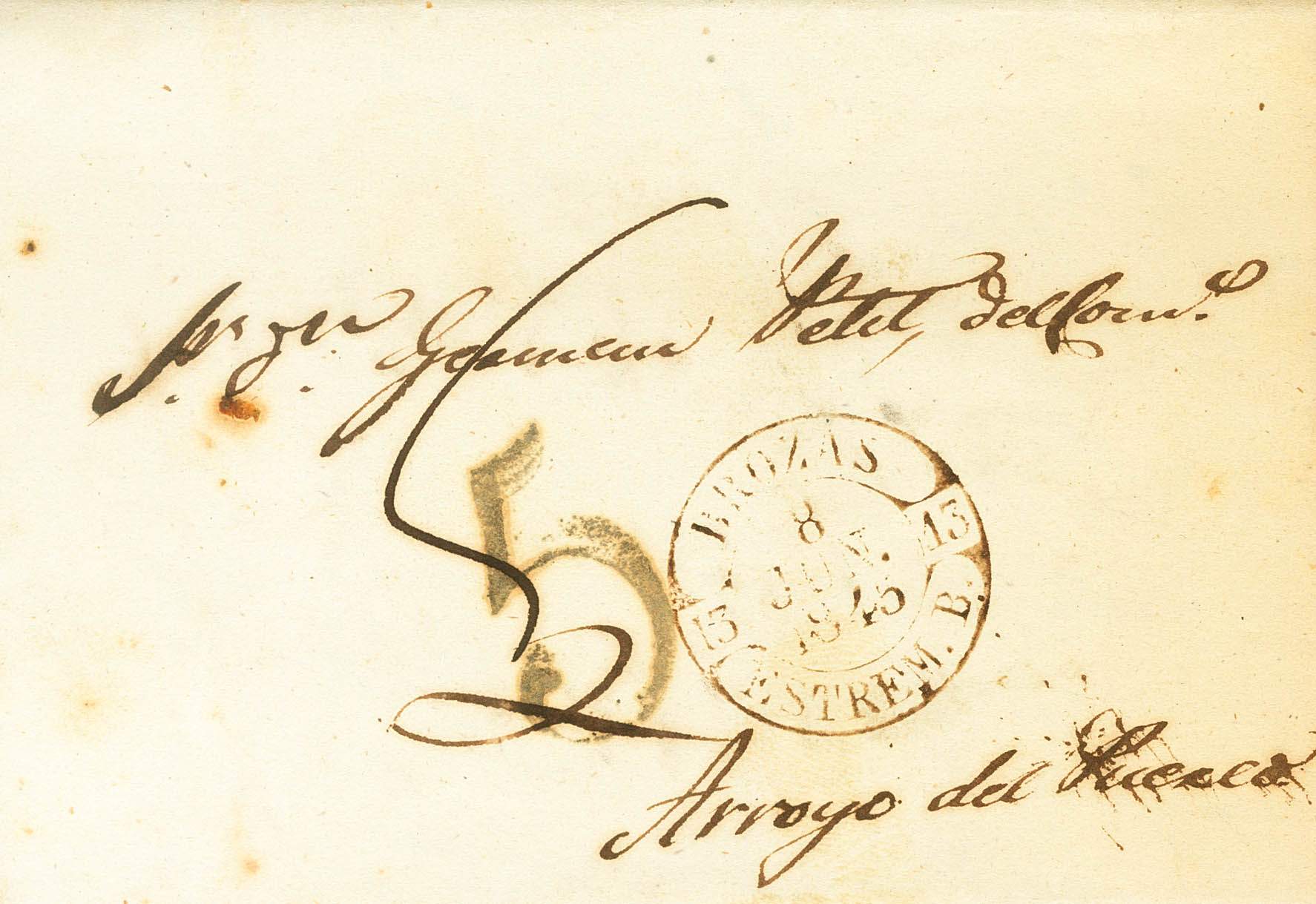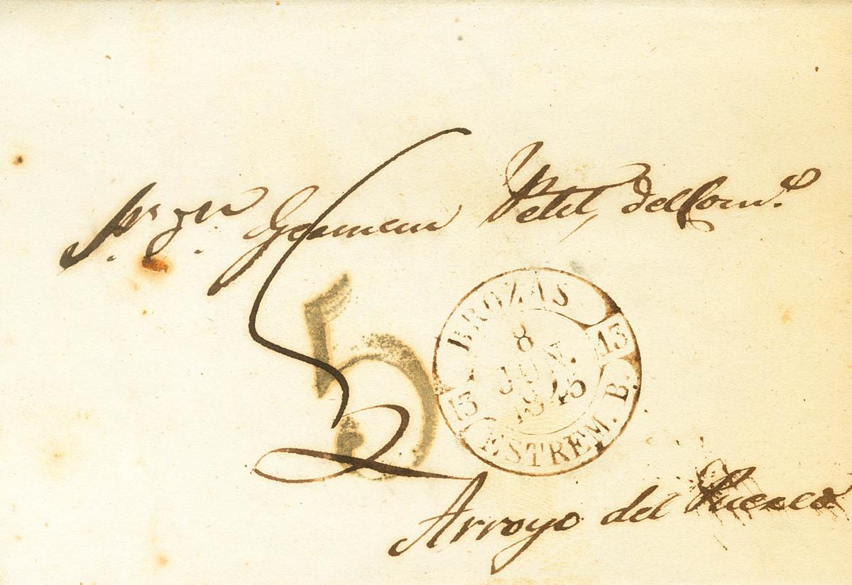 1845. BROZAS (BADAJOZ) a ARROYO DEL PUERCO. Baeza BROZAS / ESTREM.B., en negro. MAGNIFICA Y MUY RARA.