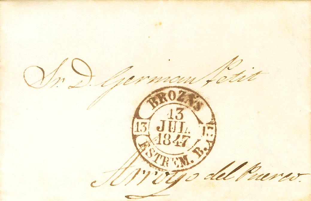 1847. BROZAS (CACERES) a ARROYO DEL PUERCO. Baeza BROZAS / ESTREM.B., en rojo oxidado. MAGNIFICA.
