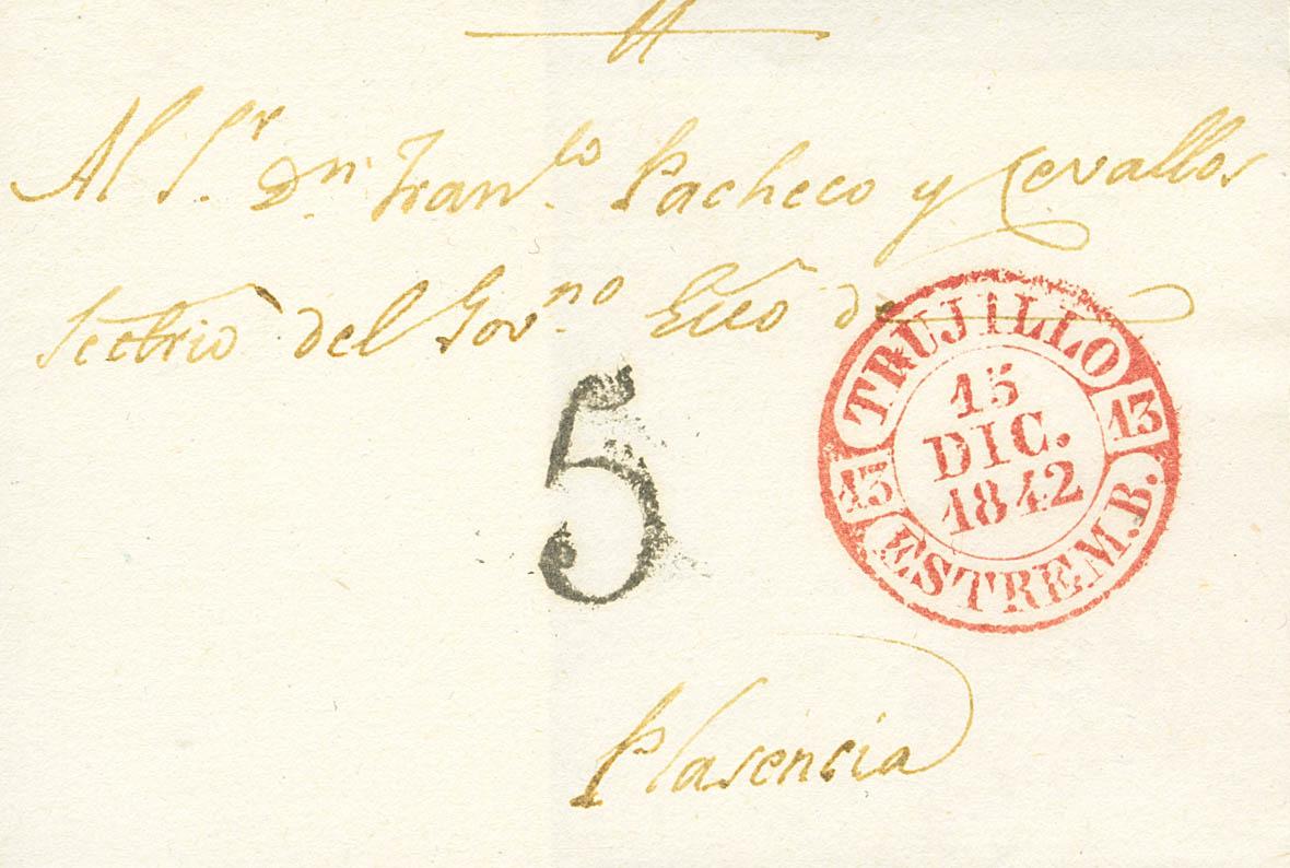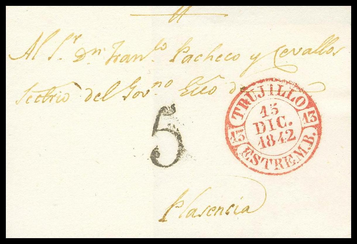 1842. TRUJILLO a PLASENCIA. Baeza TRUJILLO / ESTREM.B., en rojo. MAGNIFICA ESTAMPACION.