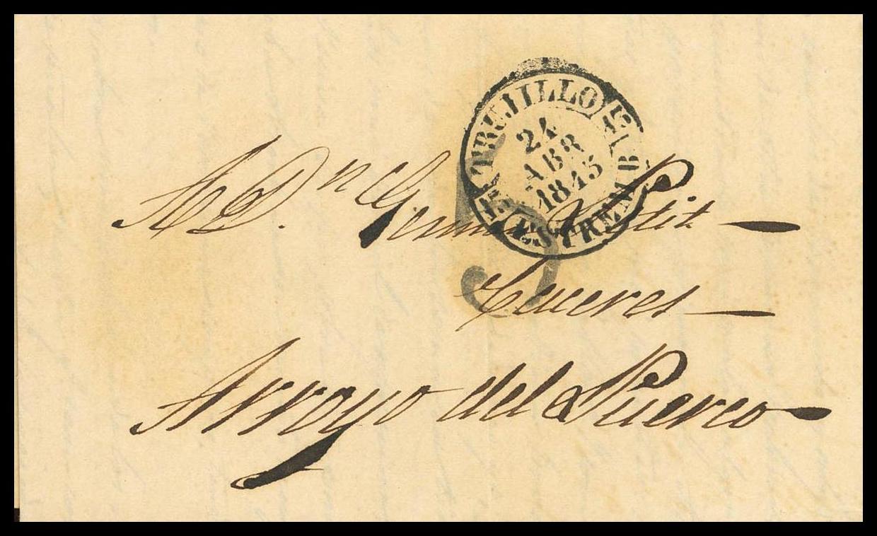 1845. TRUJILLO a ARROYO DEL PUERCO. Baeza TRUJILLO / ESTREM.B., en negro. MAGNIFICA.