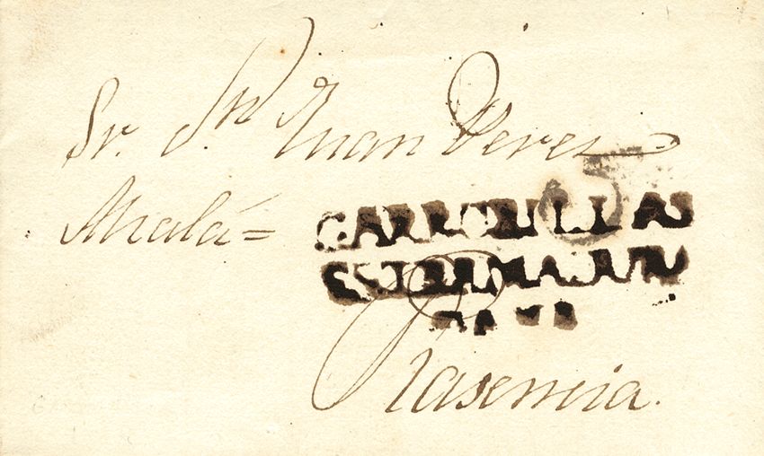 1839. GARROVILLAS a PLASENCIA. Marca GARROBILLAS / ESTREMADURA / BAXA, en tinta de escribir negro (P.E.2) edición 2004. MAGNIFICA Y RARA.