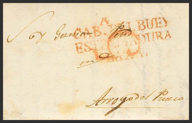 Extremadura. Prefilatelia. CABEZA DEL BUEY a ARROYO DEL PUERCO. Marca CABª DEL BUEY / ESTREMADURA / BAXA. MAGNIFICA.