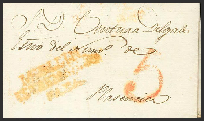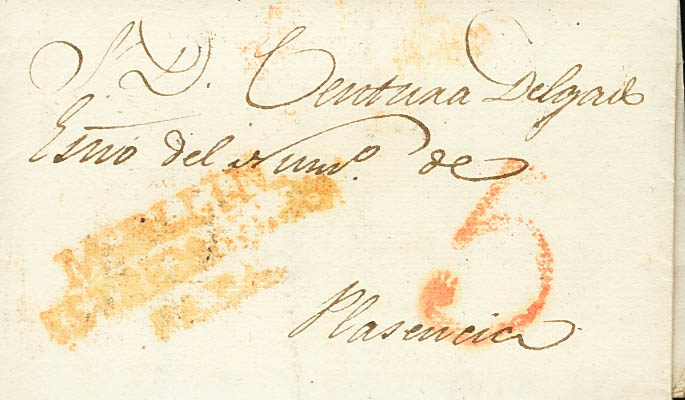 Extremadura. Prefilatelia. MEDELLIN / ESTREMADURA / BAXA, en rojo. MAGNIFICA.