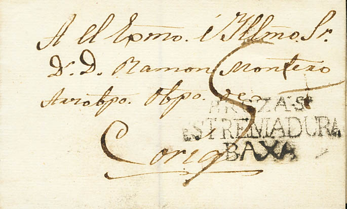 Extremadura. Prefilatelia. BROZAS / ESTREMADURA / BAXA, en negro. MAGNIFICA.