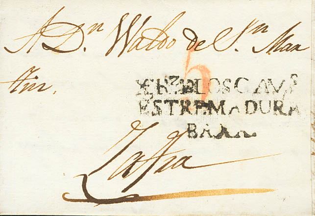 Extremadura. Prefilatelia. XERZ / DE LOS CAVS / ESTREMADURA / BAXA, en negro. MAGNIFICA.