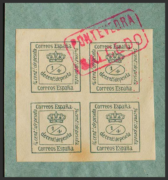 173. 1876. 4/4 cts verde, sobre fragmento. Matasello carterÃa PONTEVEDRA / SALCEDO, en rojo. MAGNIFICA Y MUY RARA.