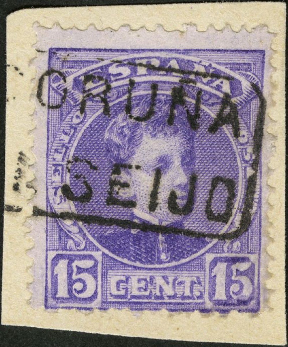 △ 245. 1901. 15 cts violeta, sobre fragmento. Matasello carterÃa CORUÑA / A SEIJO. MAGNIFICO.