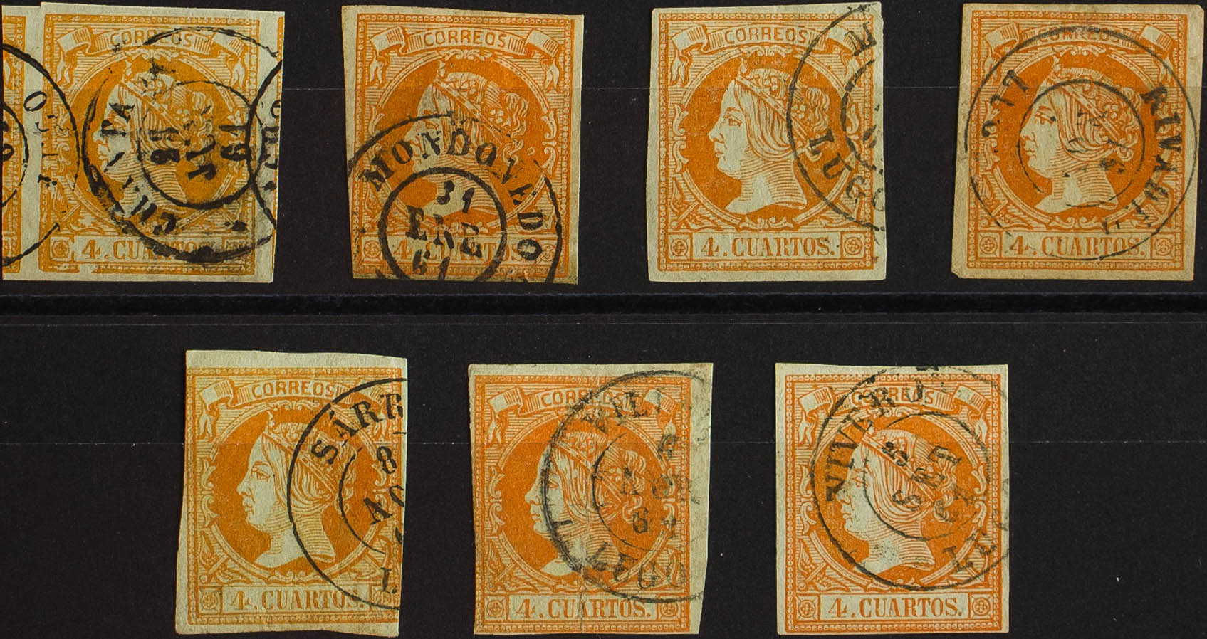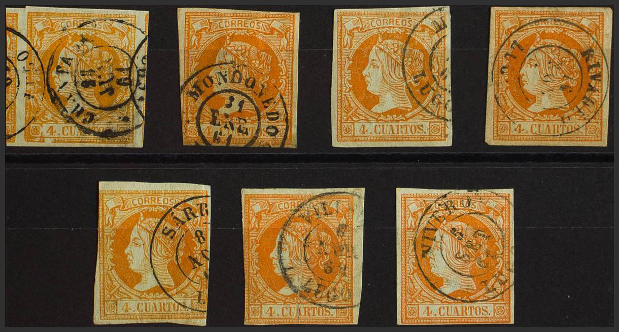 52(7). 1860. Conjunto de siete sellos del 4 cuartos amarillo inutilizados con los fechadores de la provincia de Lugo: CHANTADA, MONDOÑEDO, MONFORTE, RIVADEO, SARRIA, VILLALBA y VIVERO. MAGNIFICO.