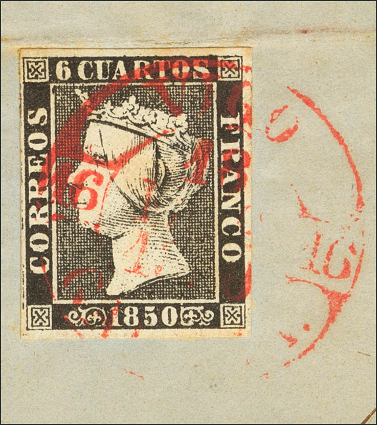 △ 1. 1850. 6 cuartos negro, sobre fragmento. Matasello VIGO / GALICIA. MAGNIFICO.