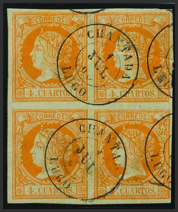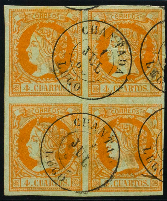 52(4). 1860. 4 cuartos naranja, bloque de cuatro. Matasello CHANTADA / LUGO. MAGNIFICO.