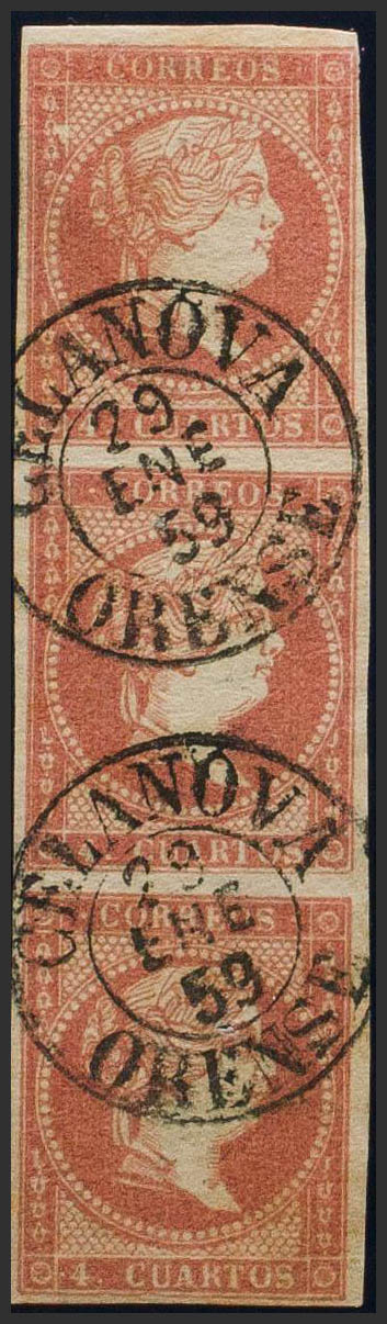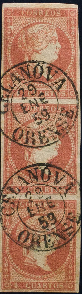 48(3). 1856. 4 cuartos rojo, tira de tres. Matasello CELANOVA / ORENSE (Tipo I). MAGNIFICA ESTAMPACION Y RARISIMA.