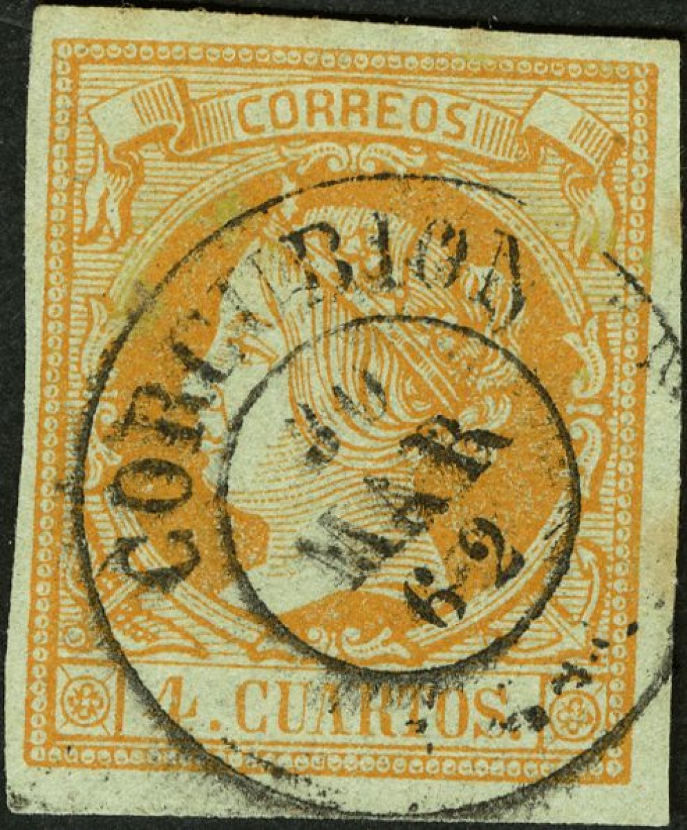 52. 1860. 4 cuartos amarillo. Matasello CORCUBION. MAGNIFICO.