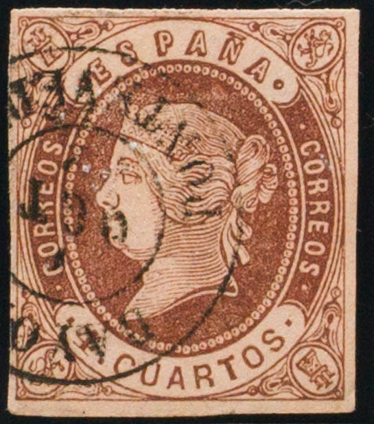 58. 1862. 4 cuartos castaño. Matasello BAYONA / PONTEVEDRA. MAGNIFICO Y RARO.