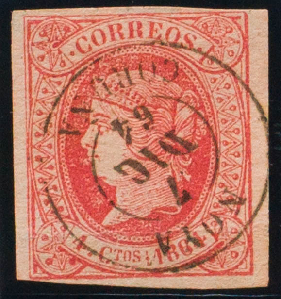 64. 1864. 4 cuartos rojo. Matasello NOYA / CORUÑA. MAGNIFICO.