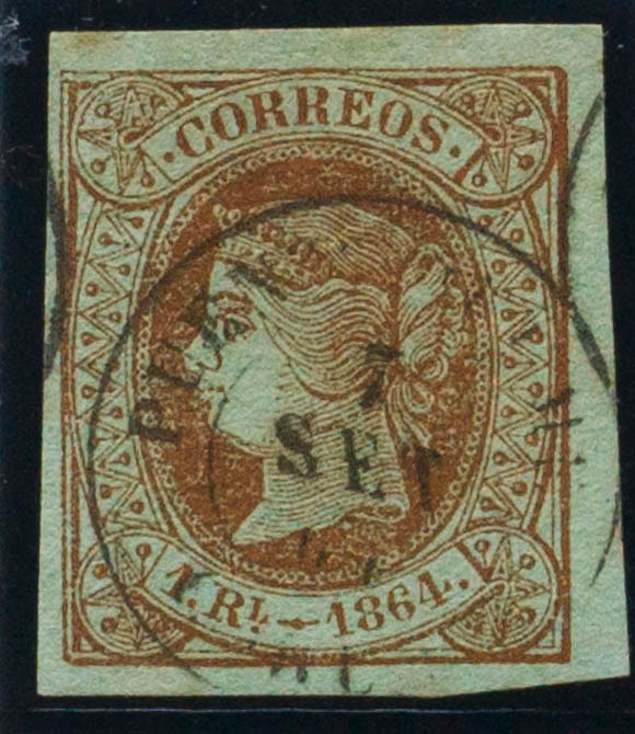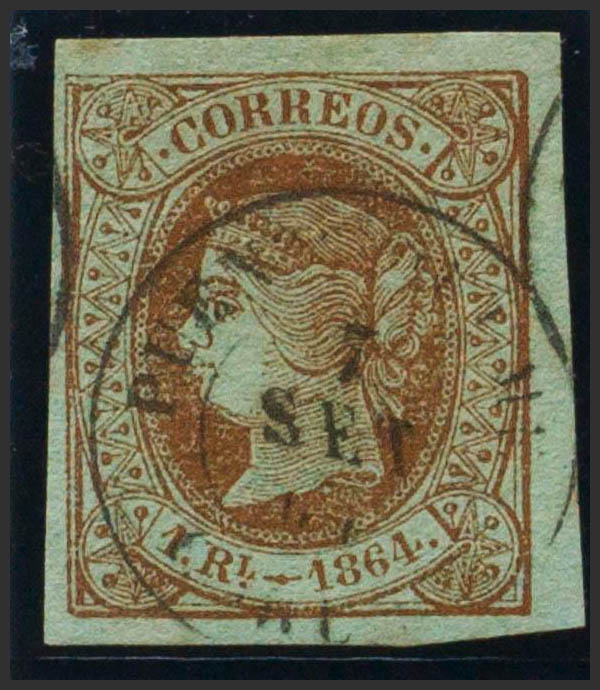 67. 1864. 1 real castaño. Matasello PUENTEDEUME / CORUÑA. MAGNIFICO Y RARO.