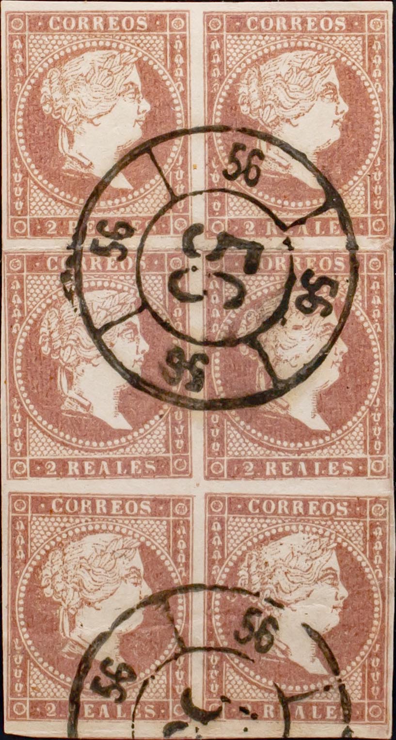 50(6). 1855. 2 reales castaño violeta, bloque de seis. Matasello R.CARRETA Nº56, de Santiago de Compostela. MAGNIFICO.
