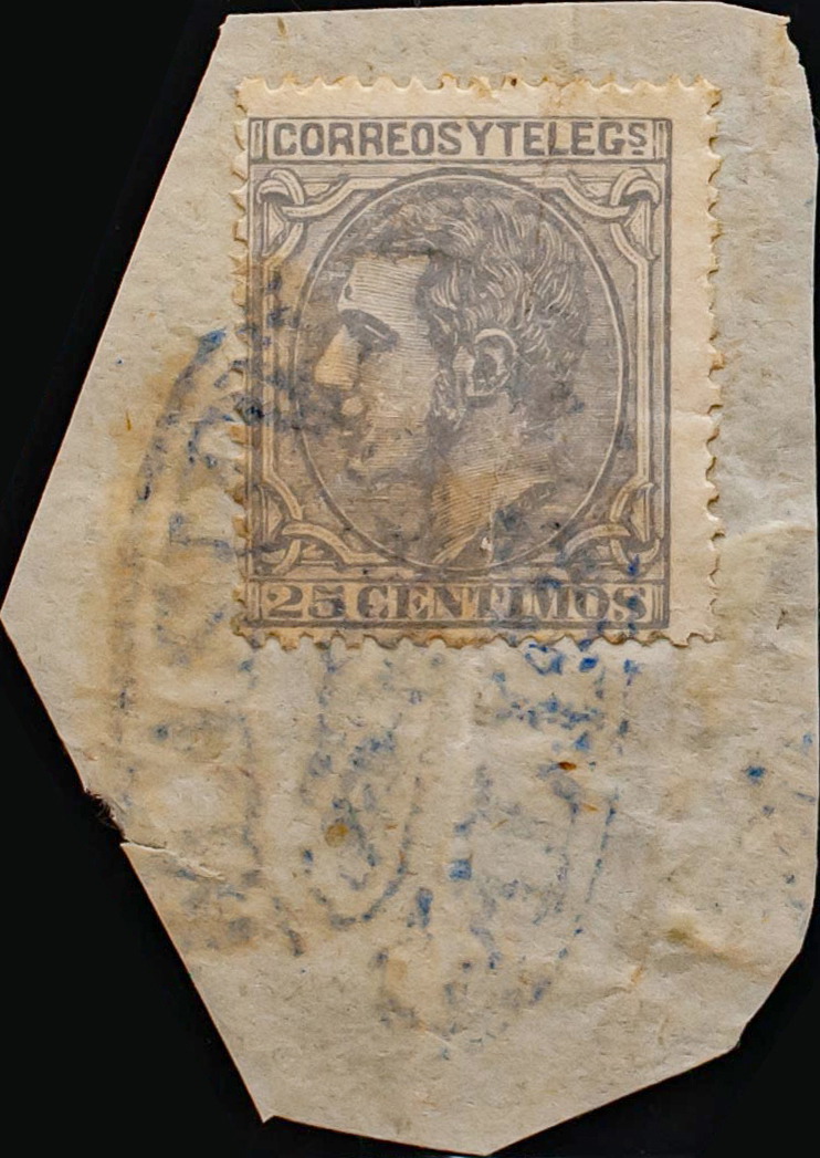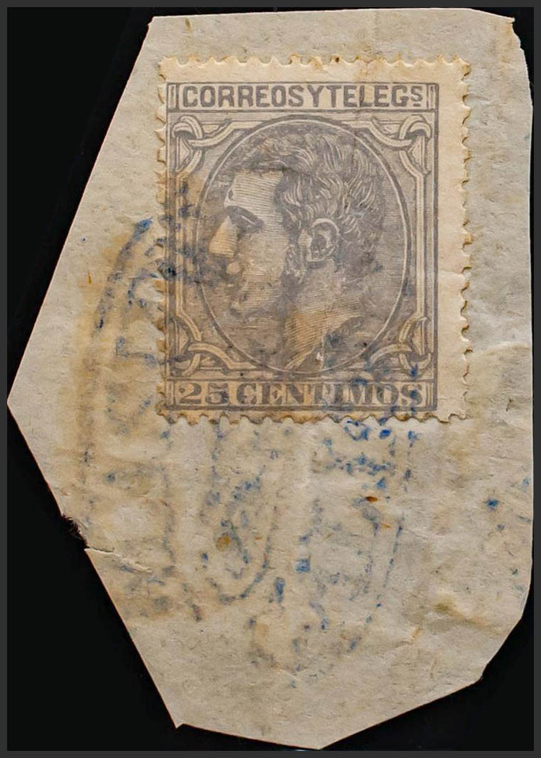 △ 204. 1879. 25 cts gris (leve pliegue sin importancia), sobre fragmento. Matasello prefilatélico MASIDE / GALICIA, en azul. BONITO Y MUY RARO.