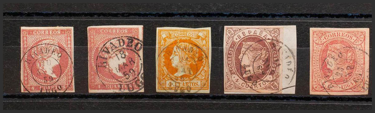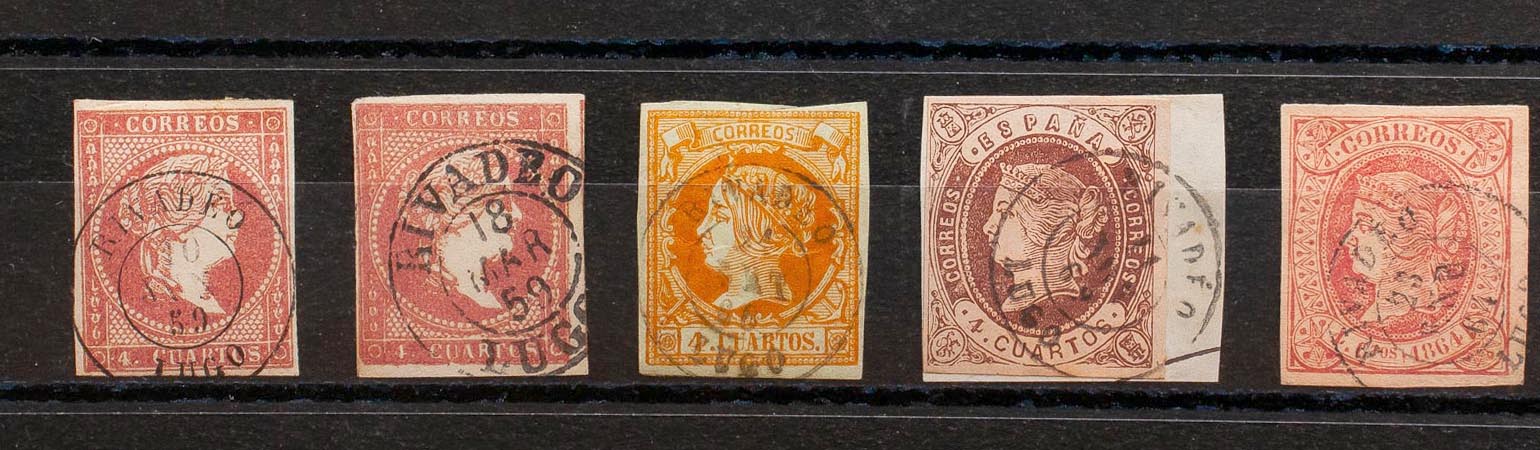 48(2), 52, 58, 64. (1855ca). Conjunto de cinco sellos del 4 cuartos rojo, amarillo, castaño y rosa, inutilizados con el matasello RIVADEO / LUGO (incluyendo el Tipo I sobre el 4 cuartos rojo). MAGNIFICO.