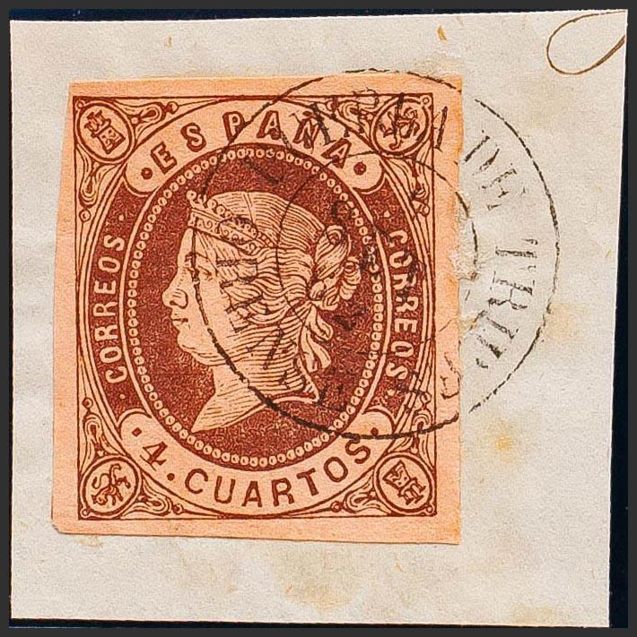 △ 58. 1862. 4 cuartos castaño, sobre fragmento. Matasello PUEBLA DE TRIBES / ORENSE. MAGNIFICO.