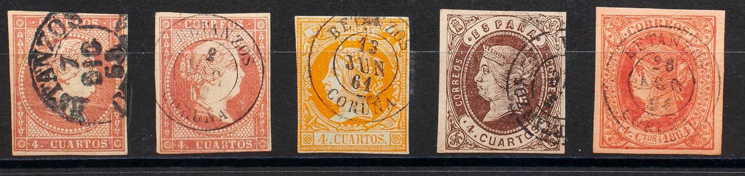 48(2), 52, 58, 64. (1855ca). Conjunto de cinco sellos del 4 cuartos rojo, amarillo, castaño y rosa, inutilizados con el matasello BETANZOS / CORUÑA (incluyendo el Tipo I sobre el 4 cuartos rojo). MAGNIFICO.