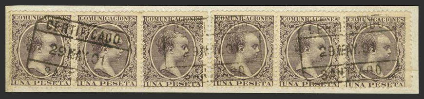 △ 226(6). 1889. 1 pts castaño, seis sellos, sobre fragmento. Matasello CERTIFICADO / SANTIAGO. MAGNIFICO.