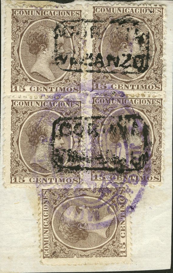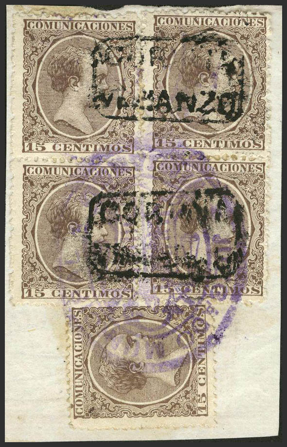 △ 219(5). 1889. 15 cts castaño, bloque de cinco. Matasello carterÃa CORUÑA / VIMIANZO. MAGNIFICO.