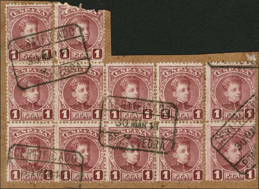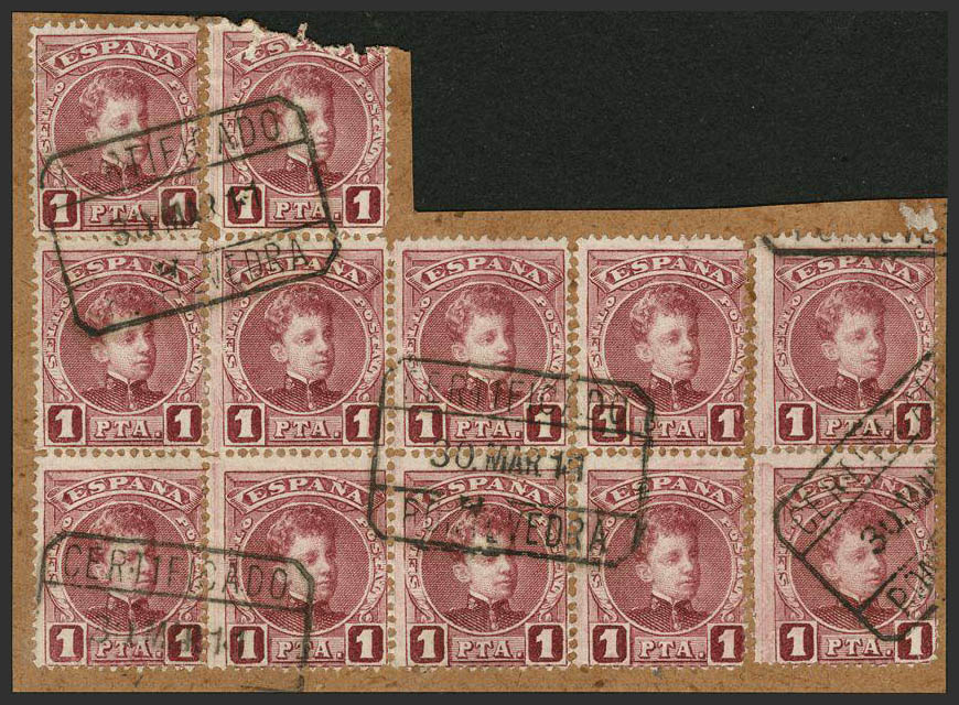 Galicia. Filatelia. CERTIFICADO / PONTEVEDRA, doce sellos (un sello defectuoso). MAGNIFICOS.