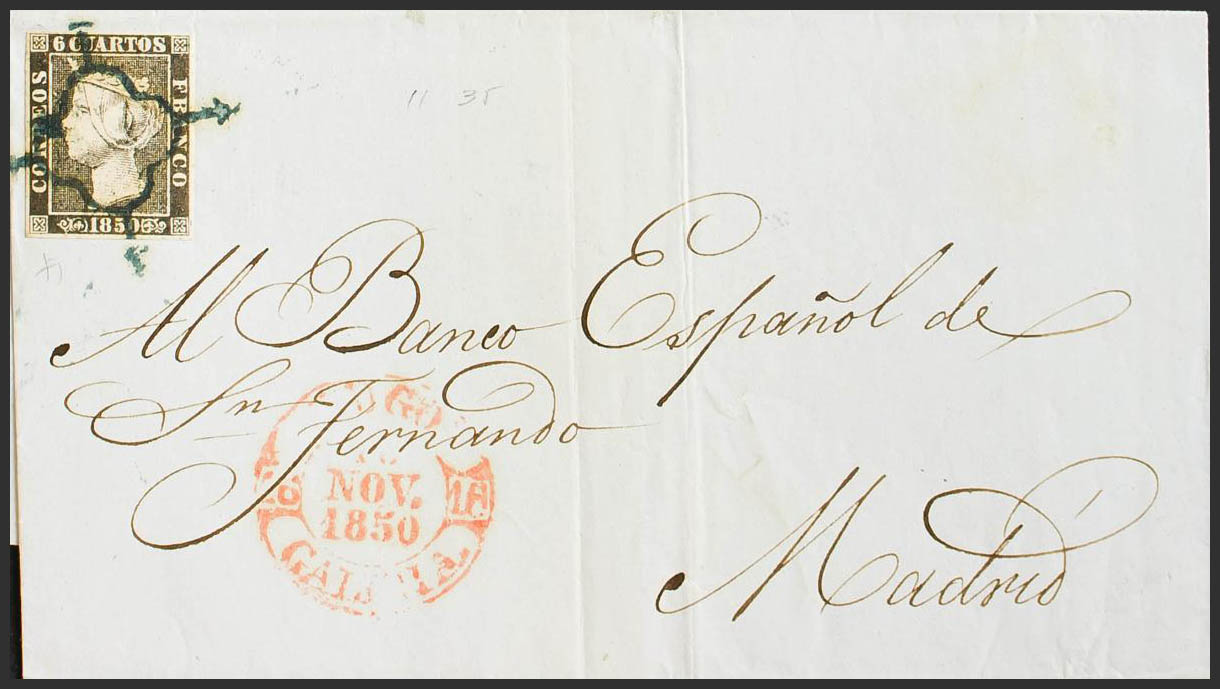 1A. 1850. 6 cuartos negro. VIGO a MADRID. Matasello ARAÑA, en azul. MAGNIFICA Y RARA. Edifil 2014: 425 Euros