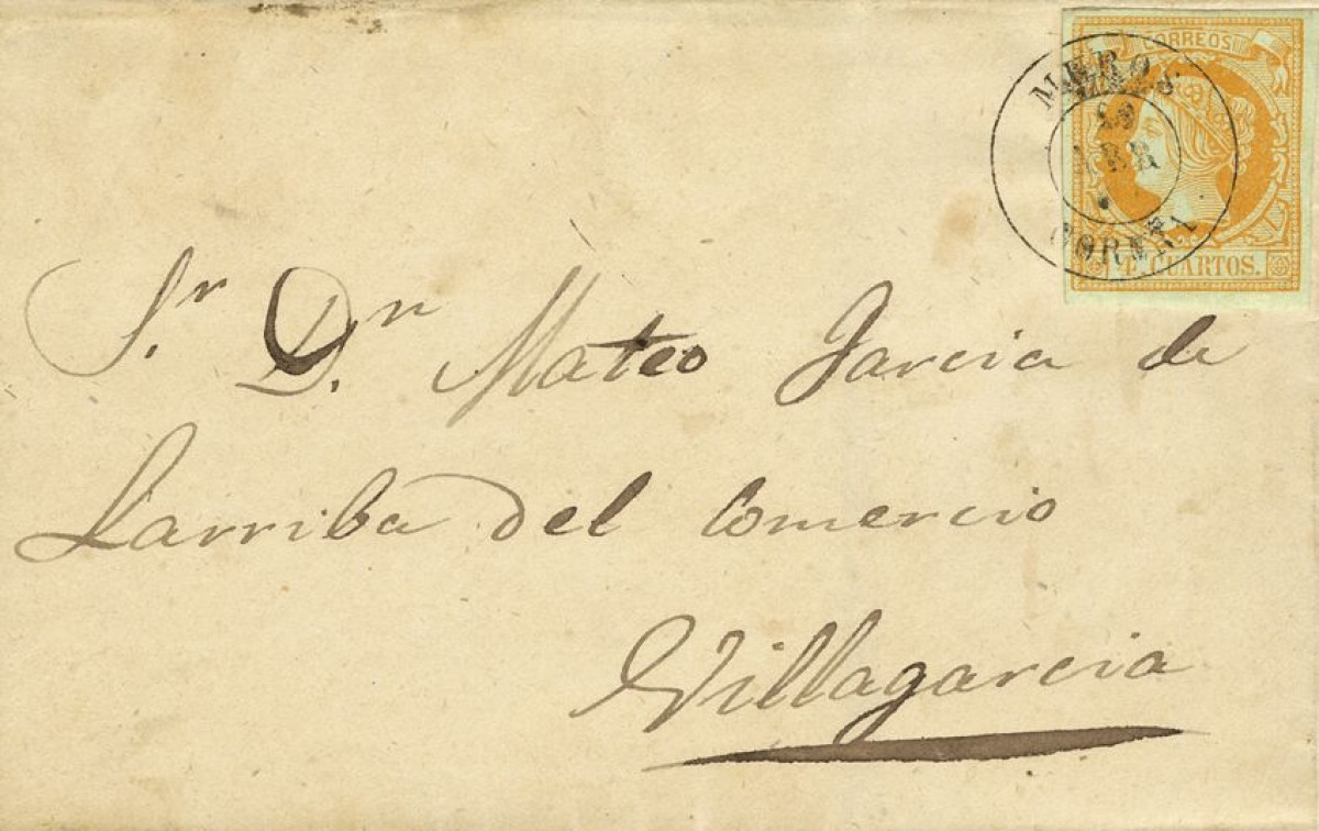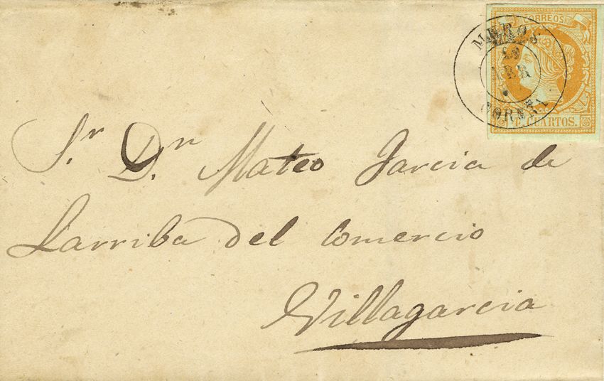 52. 1860. 4 cuartos amarillo. MUROS a VILLAGARCIA. Matasello MUROS / CORUÑA. MAGNIFICO.