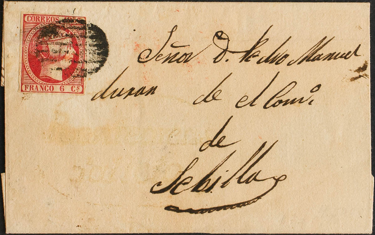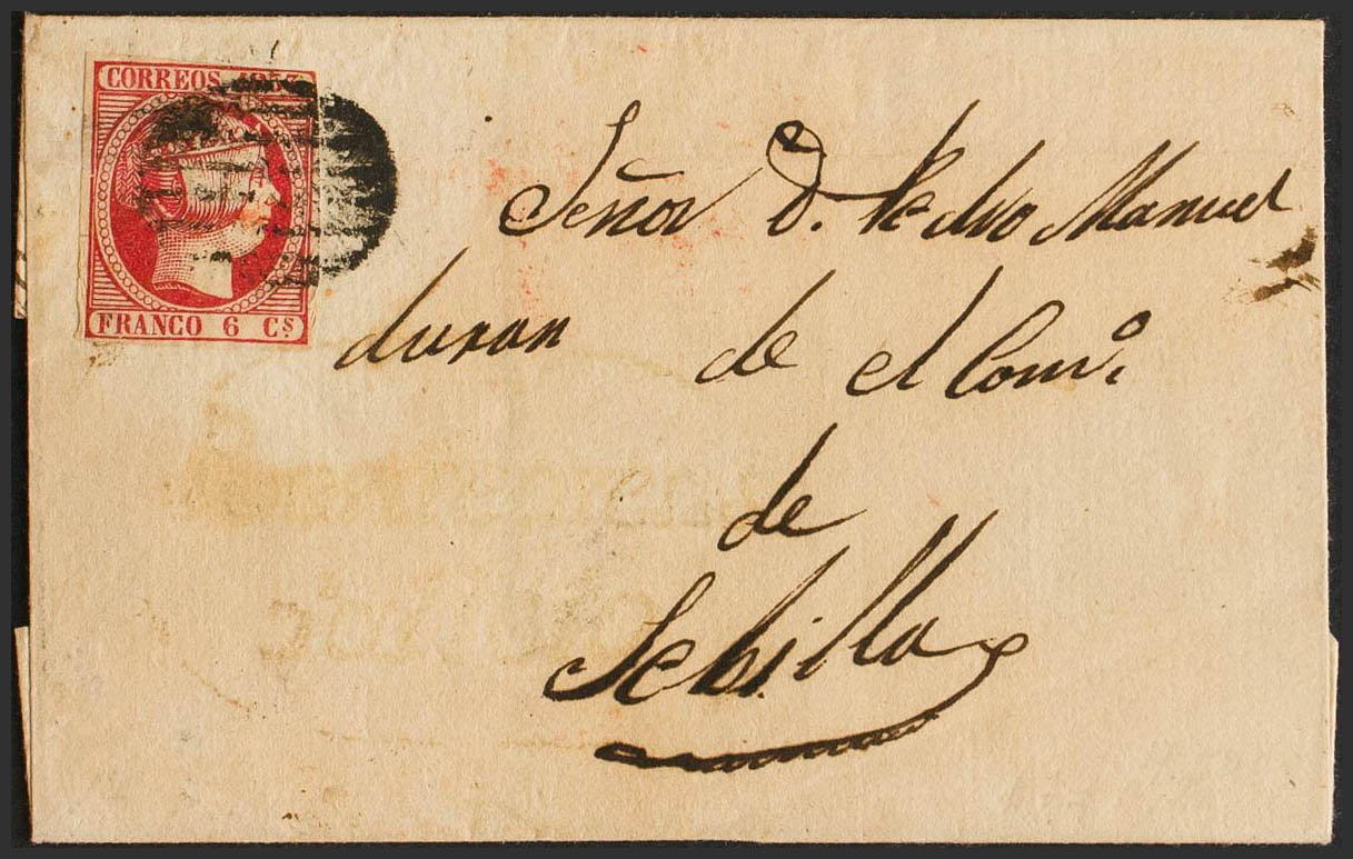 17. 1853. 6 cuartos rosa. PUENTEAREAS a SEVILLA. En el frente marca prefilatélica PUENTEAREAS / GALICIA (bien estampada pero con la tinta muy acuosa). MAGNIFICA Y RARA.