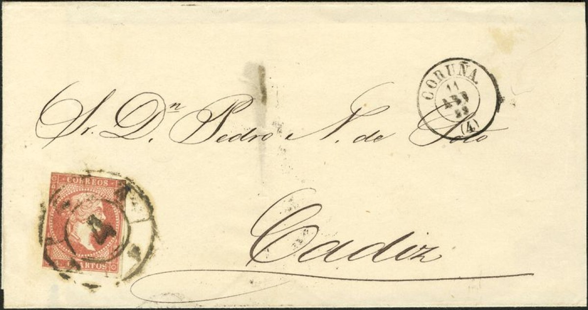 48. 1856. 4 cuartos rojo. CORUÑA a CADIZ. Matasello R. CARRETA Nº 4.