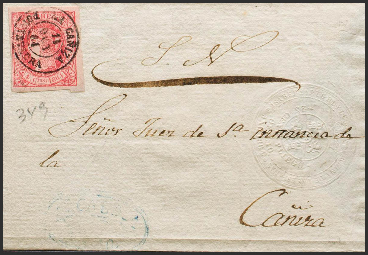 64. 1864. 4 cuartos rojo. Dirigida a LA CAÑIZA. Matasello LA CAÑIZA / PONTEVEDRA, a la llegada. MAGNIFICA Y RARA.